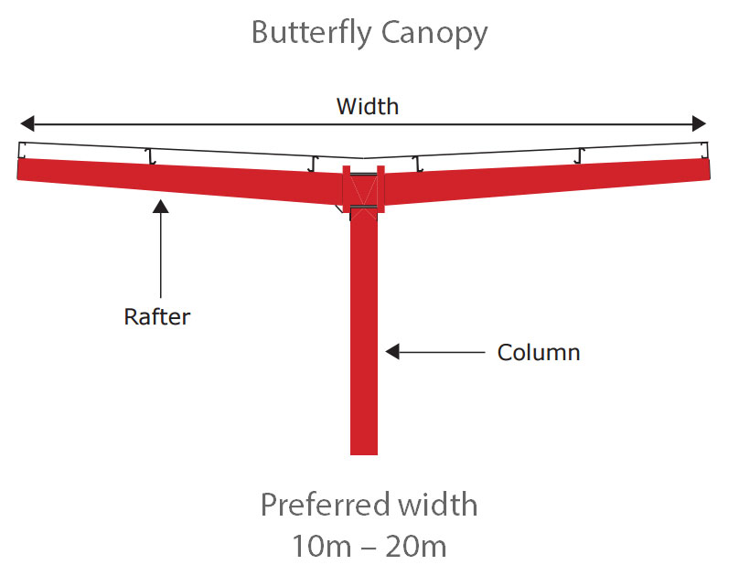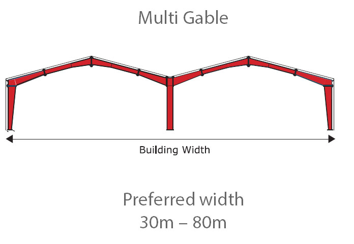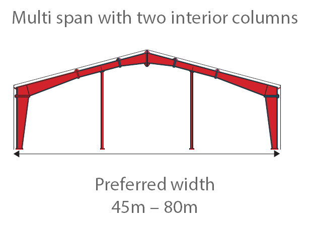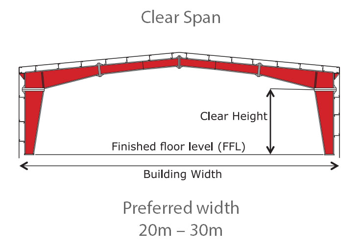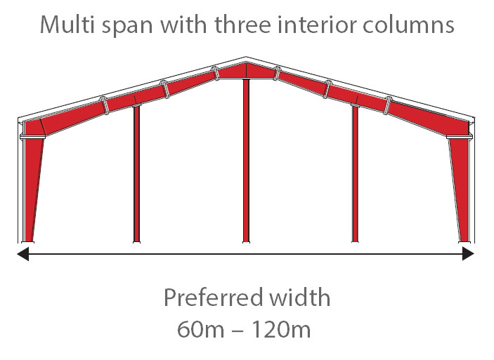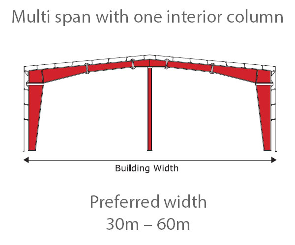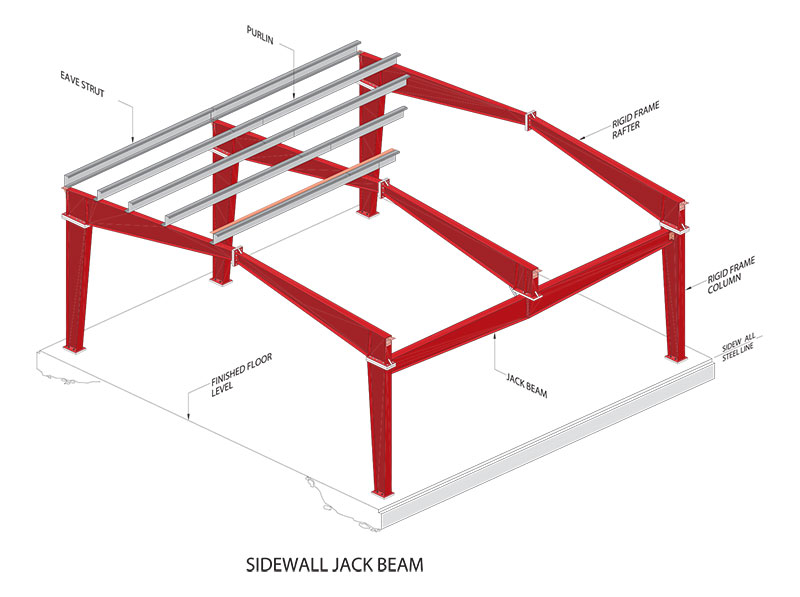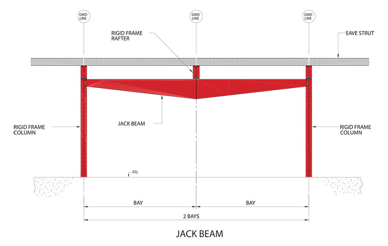 The use of jack beams is an economical and safe approach for creating longer bay length when large unobstructed space is required. Common bay length (6. 7.5, 8, 9 and 10m) can be doubled with the use of jack beams making it possible to have 12, 15, 16, 18 and 20m clear bay length in areas where unobstructed space is required. In the example below the customer specified 16m bay lengths instead of the more economical 8m bay lengths. Jack beams were used in the interior of the building to make that possible. Jack beams may also be used on the exterior sidewalls in the same way.